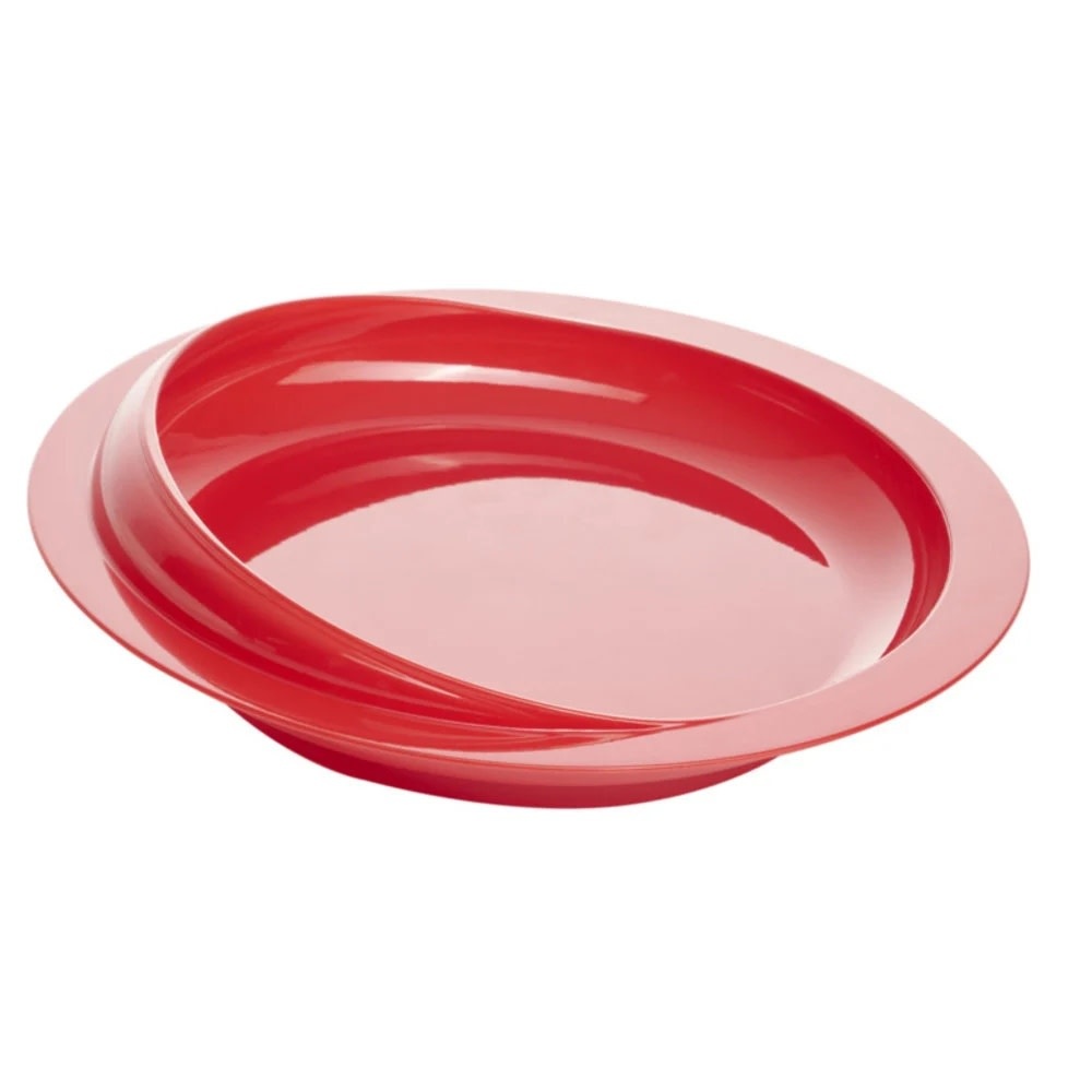 Aan één zijde is de rand verhoogd en gebogen, wat het opscheppen van voedsel op lepel of vork vergemakkelijkt. Door het voedsel tegen deze curve te duwen, rolt het gemakkelijk terug op het bestek.