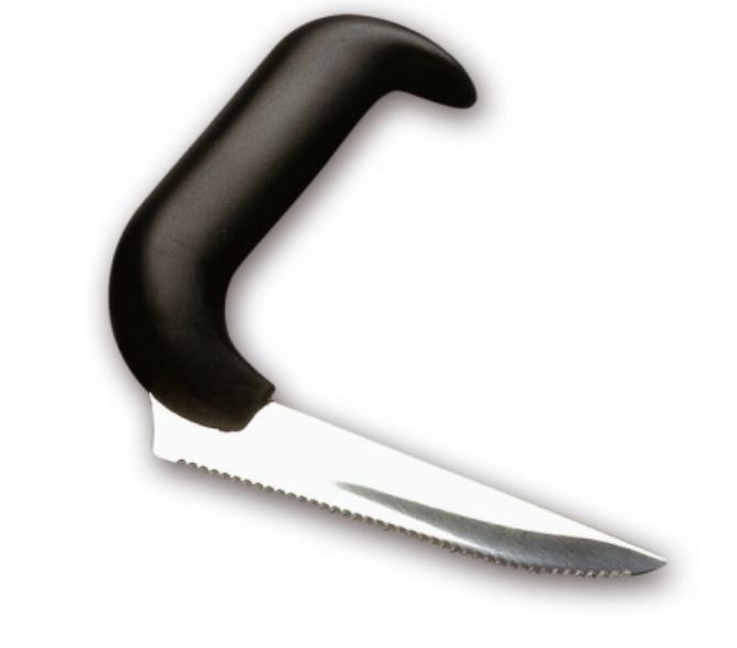 Het mes zorgt voor een ergonomische grip en minimale krachtinspanning. Het gehoekte handvat houdt de hand, pols en arm in een natuurlijke positie en voorkomt zo te grote inspanning en het forceren van de pols en hieraan gerelateerde klachten.