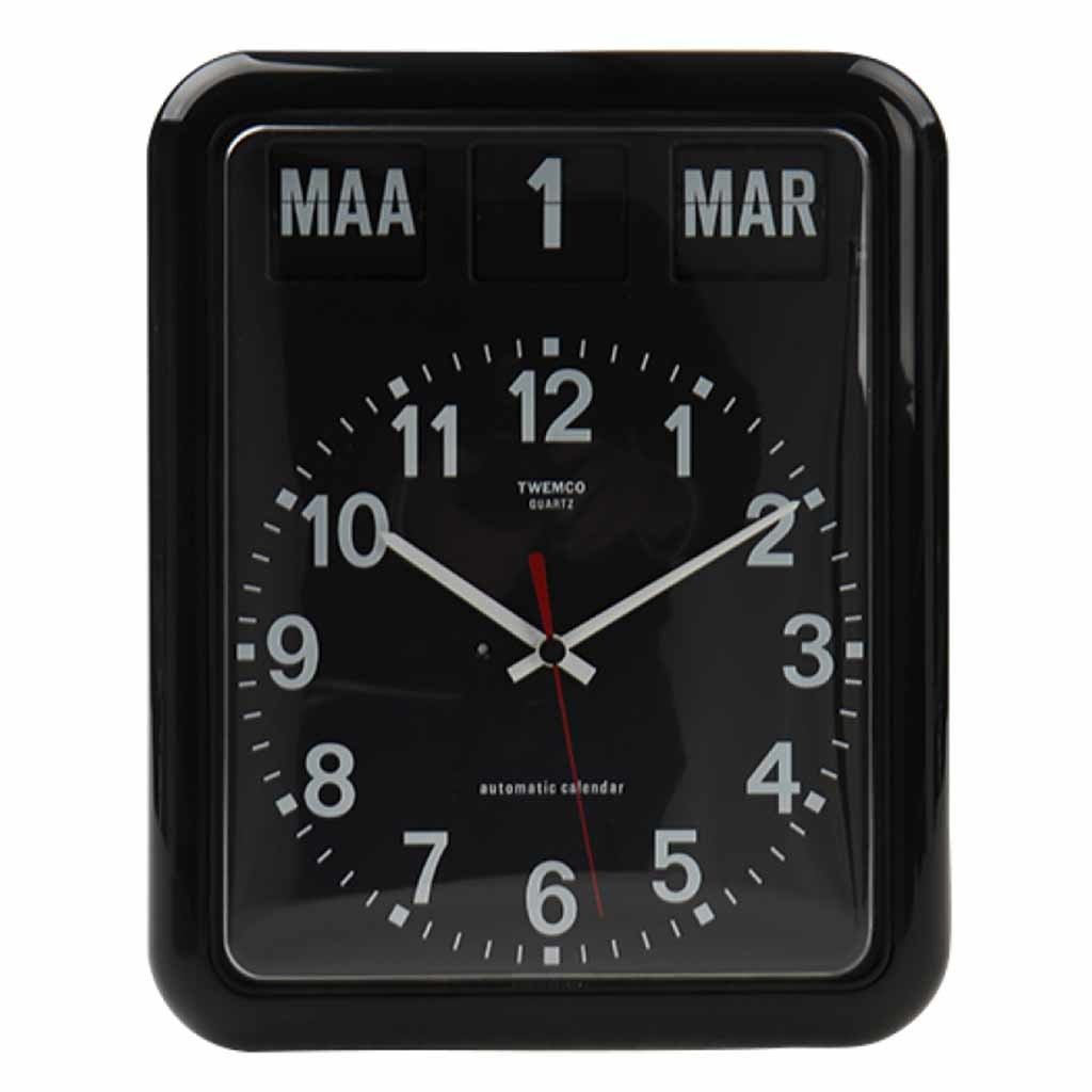 Grote Twemco kalenderklok voor slechtzienden. Dit wandmodel heeft een een grote, analoge wijzerplaat met wijzers en 12 cijfers van 3 cm hoog. De kalenderaanduiding (dag, datum en maand) heeft digitale valletters van 2,5 cm hoog op een zwarte achtergrond. Nederlandse taal.