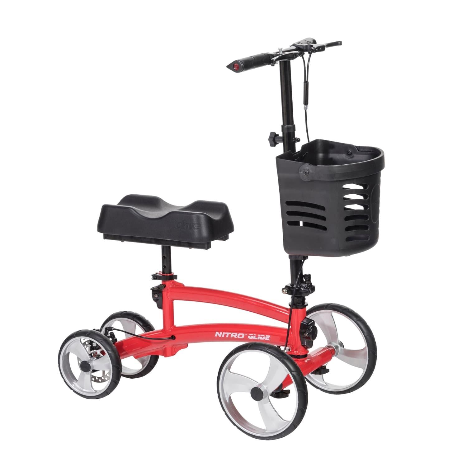 Wanneer u op zoek bent naar een elegantie oplossing bij een hertel aan het onderbeen, is de kniestep Nitro Glide van Drive een uitstekende keuze. Dankzij de elegantie van het moderne ontwerp en het gebruikscomfort kunt u geen betere kniestep vinden. Wat het model zo uniek maakt is dat de Nitro Glide zonder gereedschap eenvoudig in te stellen is op de juiste kniehoogte en stuurhoogte. Hierdoor kunt u, waar u ook bent, het meeste comfort hebben tijdens bijvoorbeeld een dagje uit.Een aantal belangrijke kenmerken op een rijtje: Vooras is verstelbaar: Aan het gebruiksgemak is gedacht, dankzij de verstelbare vooras is de Nitro Glide overal inzetbaar. Moet u door krappe binnenruimtes manoeuvreren? Dan zet u de voorwielen dichter bij elkaar. Wilt u meer stabiliteit bij buitengebruik? Zet de wielen breder uit elkaar om te genieten van maximale stabilteit. Grote voorwielen: Met de 10 inch zwenkwielen kunt u soepel over oneffenheden lopen. Gewatteerde ondersteuning: Het gevoerde beenkussen biedt comfort tijdens het gebruik en is in te stellen voor het linker- of rechterbeen. Opvouwbaar: De Nitro Glide is overal inzetbaar, bijvoorbeeld ook op vakantie of dagjes uit. Dankzij de opvouw mogelijkheid, kunt u de knee walker gemakkelijk mee nemen of opbergen. Standaard meegeleverde mand: De mand aan de voorkant van het stuur is geschikt om boodschappen of persoonlijke spullen tot 5 kg mee te nemen. De mand is ook nog afneembaar, als dat gewenst is. Of u nu herstelt van een blessure, een operatie of tijdelijke een ondersteuning nodig heeft voor het onderbeen, de kniestep Nitro Glide biedt mobiliteit, comfort en stijl inéén pakket.