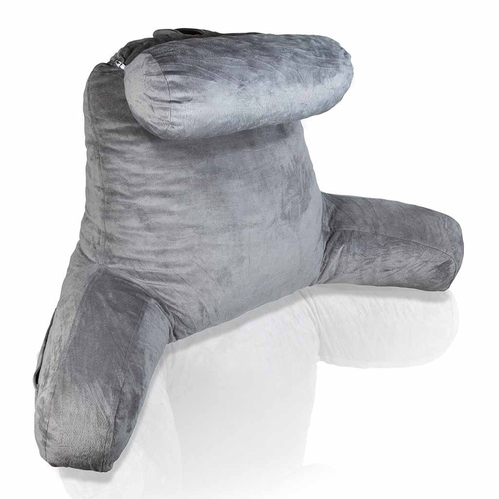 Ons hoogwaardige leeskussen biedt uitstekende ondersteuning met armleuningen die uw onderrug en zijkanten comfortabel ondersteunen tijdens lezen of tv-kijken. De afneembare hoofdsteun dient ook als handige beenverhoger of extra kussen. Het kussen bevat twee handige opbergvakken voor uw afstandsbediening of tijdschrift. Gevuld met traagschuim biedt het zowel comfort als ergonomische ondersteuning. De luxueuze suède afwerking voegt een zachte touch toe. De hoes is afneembaar en wasbaar in de machine voor eenvoudig onderhoud.
