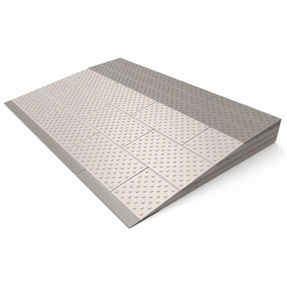 De modulaire drempelhulp is vervaardigd uit duurzaam kunststof en bestaat voor 95% uit recyclebare materialen, wat het een milieuvriendelijke keuze maakt. Het systeem is opgebouwd uit diverse onderdelen die snel en eenvoudig in elkaar gezet kunnen worden, waardoor een drempelhulp ontstaat die in elke situatie kan worden toegepast. Dankzij het modulaire ontwerp kan de drempelhulp flexibel aangepast worden aan verschillende toepassingen en is hij geschikt voor zowel binnen als buiten gebruik. Het systeem is bovendien licht van gewicht, zeer sterk en onderhoudsvrij, wat zorgt voor een lange levensduur en gebruiksgemak. Er zijn vier standaard uitvoeringen van de drempelhulp beschikbaar, die passen bij de meeste binnen- en buitendrempels. Dit maakt de modulaire drempelhulp een veelzijdige oplossing voor vrijwel elke drempeluitdaging. De montage is eenvoudig en vereist alleen een hamer; het systeem wordt geleverd met alle benodigde montagemiddelen. Bovendien bieden we vijf jaar garantie op de drempelhulp, wat bijdraagt aan de betrouwbaarheid van het product. Optie Hoogte Diepte Breedte 1 laags 1 / 1,5 / 2 cm 21 cm 84 cm 2 laags 2,5 / 3 / 3,5 / 4 cm 33 cm 84 cm 3 laags 4,5 / 5 / 5,5 / 6 cm 45 cm 84 cm 4 laags 5,6 / 7 / 7,5 / 8 cm 57 cm 84 cm Kenmerken van de modulaire drempelhulp: Modulair ontwerp: De drempelhulp bestaat uit losse onderdelen die eenvoudig in elkaar gezet kunnen worden, waardoor het systeem gemakkelijk aan te passen en te configureren is naar behoefte. Veilig en antislip: Het gehele oppervlak is voorzien van anti-slip noppen, wat zorgt voor optimale grip en veiligheid, ongeacht of het product binnen of buiten wordt gebruikt. Uitzonderlijk sterk: De drempelhulp is bestand tegen een maximale belasting van 850 kg/m², waardoor hij zelfs geschikt is voor voertuigen zoals auto’s. Dit maakt het systeem bijzonder robuust en veelzijdig. Lichtgewicht, slijtvast en UV-bestendig: Ondanks het lichte gewicht is de drempelhulp zeer sterk en bestand tegen slijtage. Het materiaal is bovendien UV-bestendig, waardoor het geschikt is voor langdurig buitengebruik zonder dat de kwaliteit afneemt. Flexibele bevestiging: De drempelhulp kan op verschillende manieren aan de ondergrond worden bevestigd, afhankelijk van de situatie en de voorkeur van de gebruiker. Met deze modulaire drempelhulp kunt u rekenen op een veilige, betrouwbare en flexibele oplossing die in vrijwel elke situatie toepasbaar is. Dankzij de uitgebreide maatwerkmogelijkheden en de gemakkelijke montage is dit systeem een ideale keuze voor zowel particuliere als professionele toepassingen.