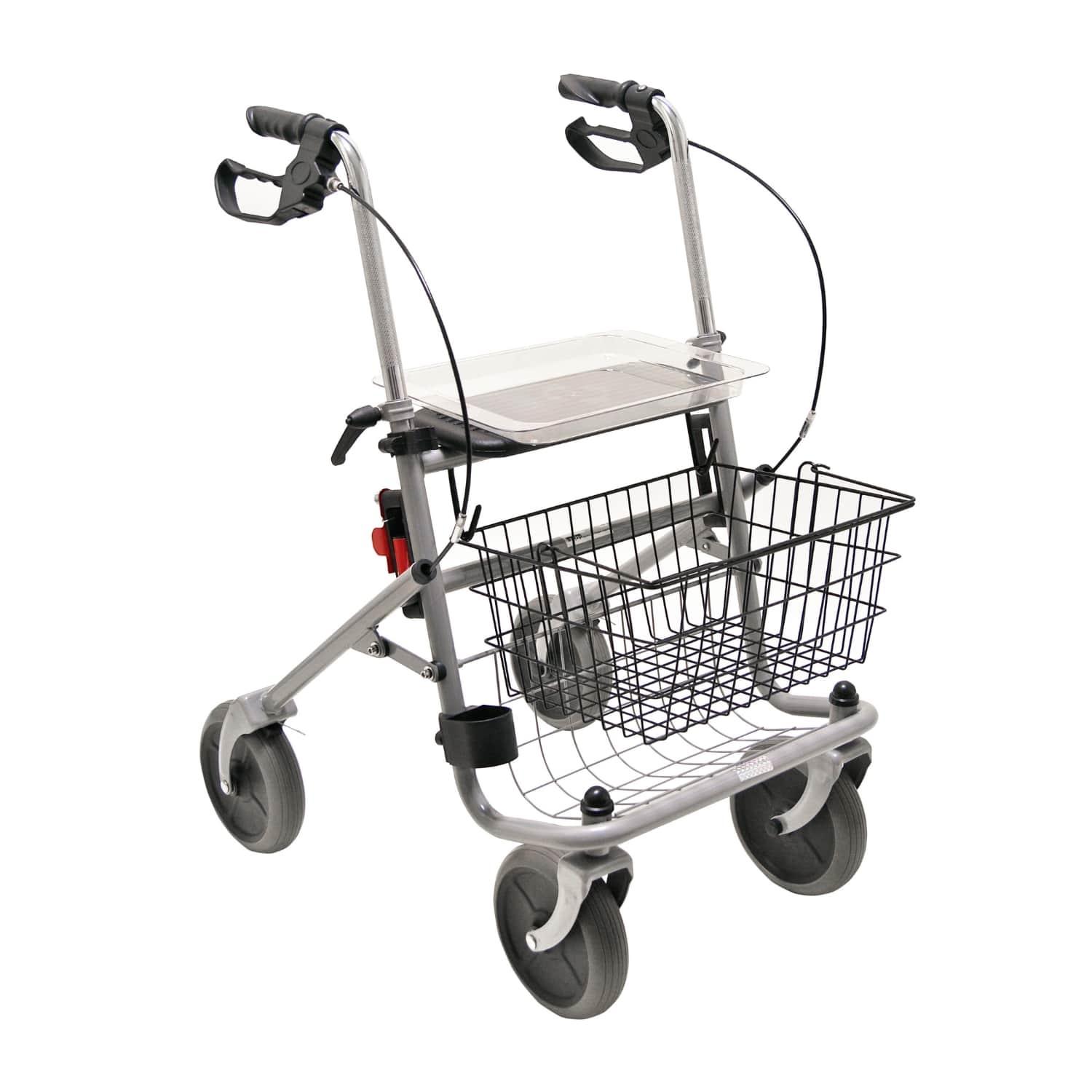 De rollator Cristallo wordt gekenmerkt door drie belangrijke eigenschappen: robuustheid, functionaliteit en comfort. Deze kenmerken bieden u meer zekerheid en stabiliteit tijdens het lopen. Voor betere zichtbaarheid is de rollator Cristallo voorzien van meerdere reflectoren en heeft deze 190/50mm lekvrije banden, waardoor u zich geen zorgen hoeft te maken over het plakken van een band. Remmen met de rollator Cristallo Het is belangrijk dat u veilig kunt lopen met de rollator Cristallo. Daarom vindt u onder de handvatten remhendels, welke een dubbele functie hebben. Inknijpen: Wanneer u de remhendels inknijpt tijdens het lopen met de rollator, remt u de rollator. Dit is bijvoorbeeld prettig bij het lopen van een helling, zodat u ten allen tijden stil kunt staan. Naar beneden duwen: Om veilig te zitten op de rollator Cristallo, is het belangrijk dat de rollator op de rem staat. Dit doet u door de remhendels naar beneden te duwen, tot u een klik hoort. Wilt u de rem eraf halen? Knijp simpelweg de remhendels omhoog en de parkeerrem gaat ervan af. Opvouwbaar en beveiliging De rollator Cristallo is voorzien van een beveiligd opvouwmechanisme, zodat u er altijd zeker van bent dat de rollator niet zomaar opvouwt tijdens het lopen. Wanneer u de rollator bijvoorbeeld wilt meenemen in de auto, duwt u simpelweg de ‘rode’ hendel opzij en trekt u aan de stang om de Cristallo op te vouwen. Kleine tip: Wanneer u de rollator opvouwt, zet de handvathoogte op de laagste hoogte. Hierdoor neemt de Cristallo minder ruimte in beslag in de auto. Voor binnen en buiten gebruik Doordat de rollator Cristallo met vele handige accessoires wordt geleverd, is deze breed inzetbaar. Zo kunt u dit model binnenshuis gebruiken als binnen rollator, dankzij het meegeleverde dienblad waarop u spullen kunt meenemen. Accessoires bij levering: Mand voor boodschappen Dienblad voor binnengebruik Stok- of parapluhouder Wanneer u de Cristallo koopt, wordt deze zo goed als gemonteerd bij u afgeleverd. Het enige wat gedaan moet worden om dit model gebruiksklaar te hebben is de handvatten van de rollator in de buis te plaatsen en op de juiste handvathoogte af te stellen. Voor deze handeling is geen gereedschap nodig, waardoor de rollator Cristallo snel in gebruik kan worden genomen.