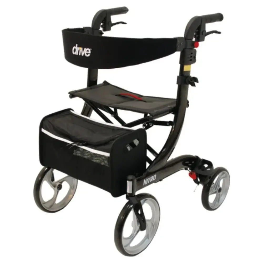 De rollator Nitro van Drive is standaard voorzien van grote voorwielen en rondom soft-banden voor maximaal stuur- en rijcomfort. Dit zorgt ervoor dat u tijdens het lopen met de rollator minder trillingen voelt en ook dat het overbruggen van oneffenheden een stuk makkelijker gaat. De rollator Nitro is daaroméén van de meest verkochte rollators van Nederland. Ook aan andere dingen zijn gedacht, zoals de remkabels die zijn weggewerkt in het frame. Hierdoor kunt u nergens meer achter blijven hangen met loshangende remkabels en kunt u zorgeloos rondlopen, binnen en buiten. Drie verschillende maten van derollator Nitro Wanneer u kiest voor de rollator Nitro, is het belangrijk dat u de juiste maat kiest. Let hierbij op, de maat is enkel voor de zithoogte en de handvathoogte. De lengte en breedte van de rollator blijft bij alle modellen hetzelfde. Small is geschikt voor iedereen tussen de 150 en 160cm lichaamslengte Verkrijgbaar in 1 kleur: Champagne Medium is geschikt voor iedereen tussen de 160 en 180 cm lichaamslengte Verkrijgbaar in 4 kleuren: Champagne, rood, wit of zwart Large is geschikt voor iedereen tussen de 180 en 195 cm lichaamslengte Verkrijgbaar in 2 kleuren: Champagne of wit Klaar voor gebruik bezorgd De rollator Nitro wordt gemonteerd en zo goed als klaar voor gebruik bij u bezorgt in een doos. Het enige wat er nog gedaan moet worden bij binnenkomst is de hoogte van de handvatten op de juiste hoogte af te stellen en de tas in de 2 houders te schuiven. Om deze handelingenuit te voeren heeft u geen gereedschap nodig. Standaard compleet uitgerust De rollator Nitro wordt standaard compleet uitgerust zodat u tijdens een mooie wandeltocht kunt geniet van rij- en zitcomfort. De soft banden op alle 4 de wielen zorgen voor minder trillingen en kunnen ook niet lek gaan. Zo kunt u zorgeloos een wandeling door bijvoorbeeld het park doen. Mocht u tijdens de wandeling even willen uitrusten of simpelweg van het uitzicht willen genieten? De rollator Nitro heeft een comfortabele zitting en een verstelbare rugsteun om tot rust te komen. Op zoek naar een andere lichtgewicht rollator? Bekijk ze hier. Makkelijk mee te nemen Uiteraard wilt u ook de mogelijkheid hebben om de rollator mee te kunnen nemen voor een dagje uit of op vakantie. Op de zitting vindt u een lus, welke u simpelweg omhoog hoeft te trekken om de rollator op te vouwen. Met een gewicht van slechts 7,2 kg isde rollator makkelijk in gebruik en is het meenemen een stuk aangenamer. De afmetingen wanneer de rollator Nitro is opgevouwen zijn: 70,5 x 25 x 82 cm (L x B x H).
