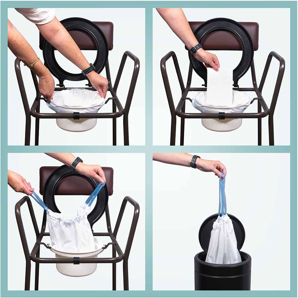 Deze toiletemmer zakken zijn gemaakt van lekbestendig materiaal van medische kwaliteit en worden geleverd met superabsorberende pads. Elke pad verandert 450 ml vloeistof snel in een gel. De toiletemmer zakken zijn geschikt voor eenmalig gebruik. Ze helpen geurtjes te elimineren en kunnen met het gewone huisvuil worden weggegooid. De zakken zijn voorzien van geïntegreerde lussen die gemakkelijk te sluiten en te strikken zijn. Geleverd in een doos met 50 zakken en 50 pads.