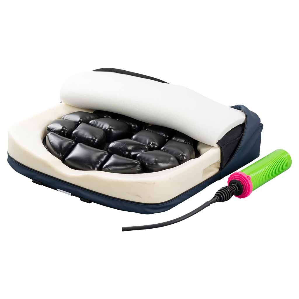 Dit kussen is voorzien van een vulling van High-Density schuim en aanpasbare luchtkamers bij het zitgedeelte. De verstelbare luchtkamers maken het mogelijk om de stevigheid eenvoudig aan te passen door het kussen harder of zachter op te pompen. Hierdoor geniet u altijd van de perfecte ondersteuning.
