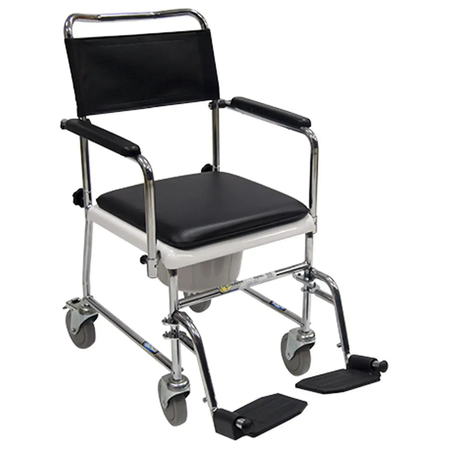 De verrijdbare toiletstoel Merrot van Scootplaza is voorzien van 4 wielen, waarvan de twee achterwielen op de rem kunnen worden gezet om bijvoorbeeld veilig een transfer te kunnen maken. Standaard word de toiletstoel Merrot geleverd met een toiletemmer (5 liter inhoud) met deksel, echter is het ook mogelijk om de verrijdbare toiletstoel over het toilet te rijden. Dit zorgt ervoor dat de toiletstoel functioneel en praktisch in gebruik is, ongeacht de situatie waar deze ondersteuning moet bieden. Kenmerken van de verrijdbare toiletstoel Merrot Standaard geleverd inclusief emmer met deksel Achterwielen zijn voorzien van remmen Armleuning zijn wegklapbaar voor transfer Voetsteunen zijn in lengte verstelbaar en wegzwenkbaar