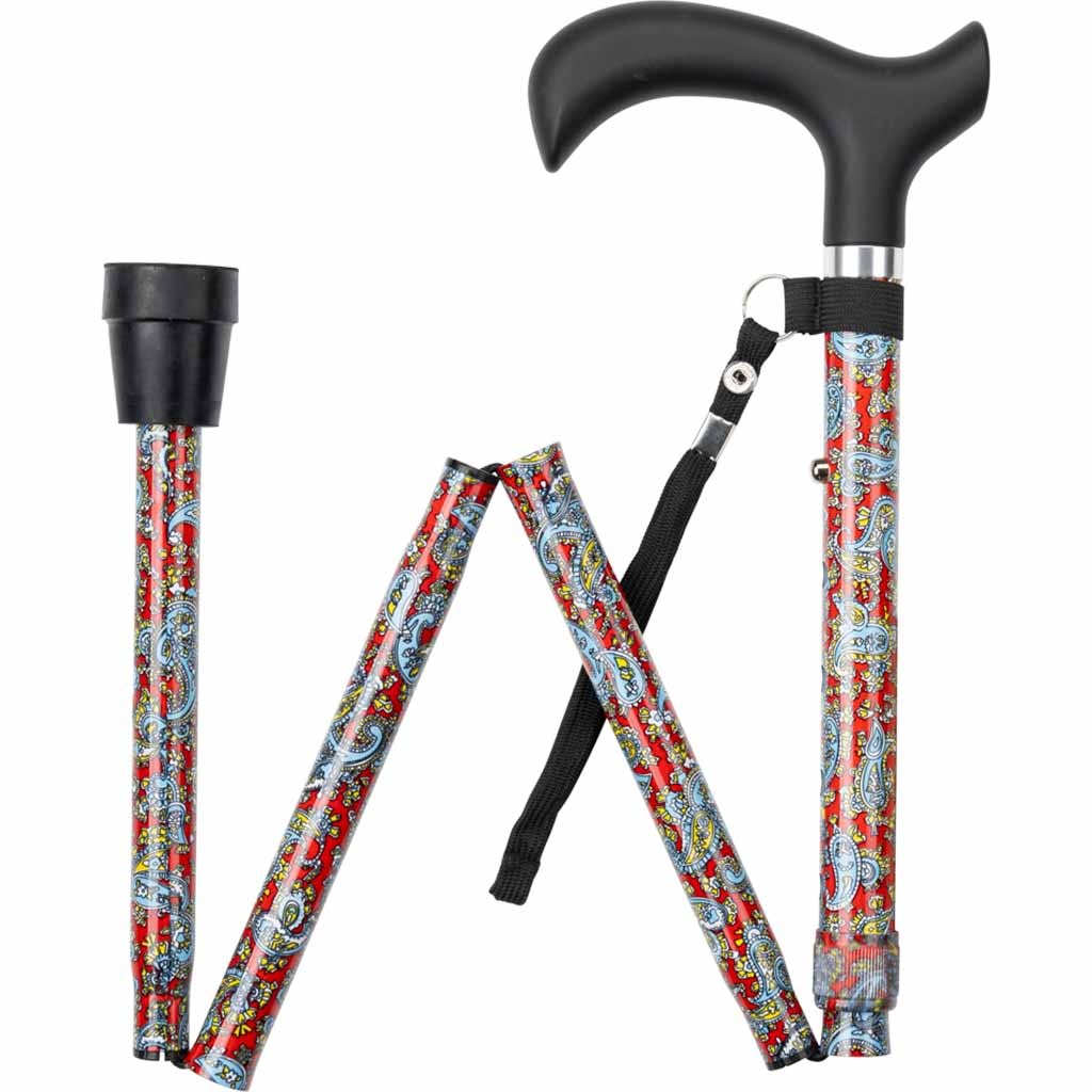 Deze handige wandelstok is ideaal voor mensen die mobiliteit en comfort waarderen. De stok is gemaakt van stevig aluminium met een rood Paisley motief en is inklapbaar, waardoor hij extra compact is en gemakkelijk kan worden opgeborgen. De rubberen dop aan de onderkant biedt een uitstekende grip en absorbeert schokken, wat zorgt voor meer comfort tijdens het lopen. Het ergonomisch gevormde handvat ligt prettig in de hand en zorgt voor een comfortabele ondersteuning.